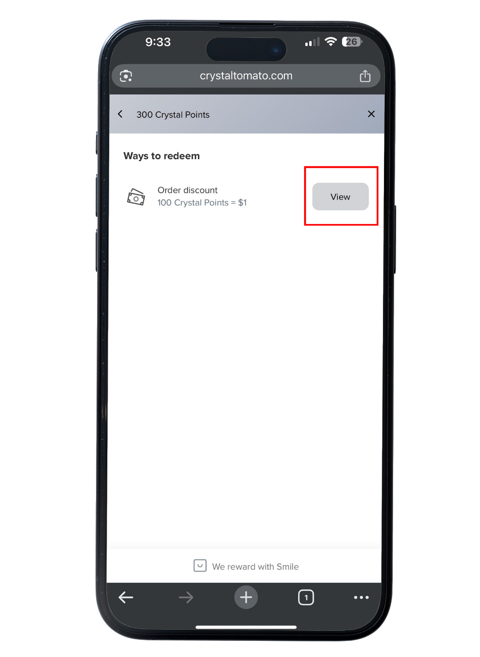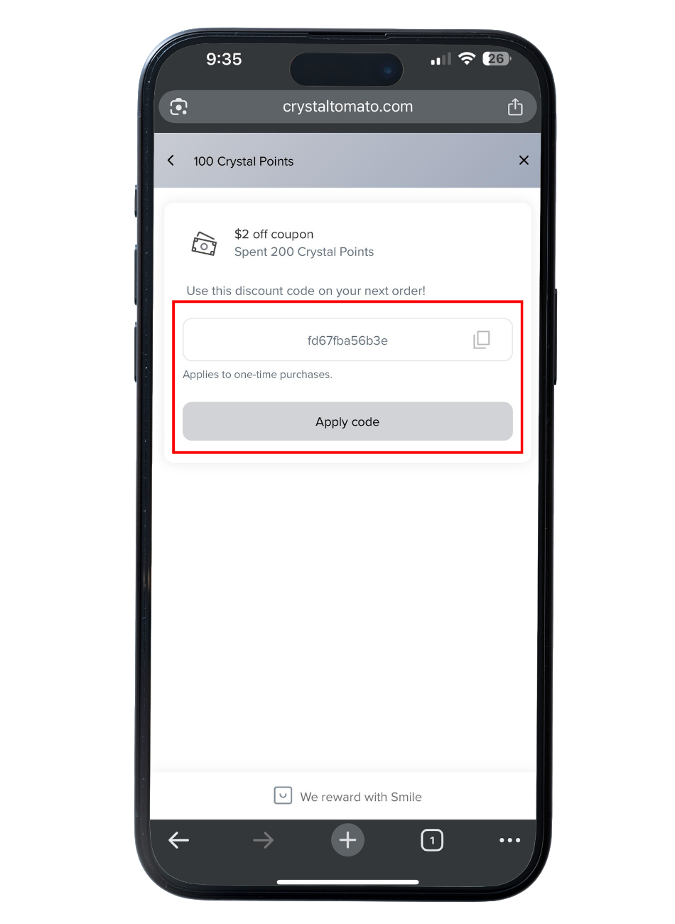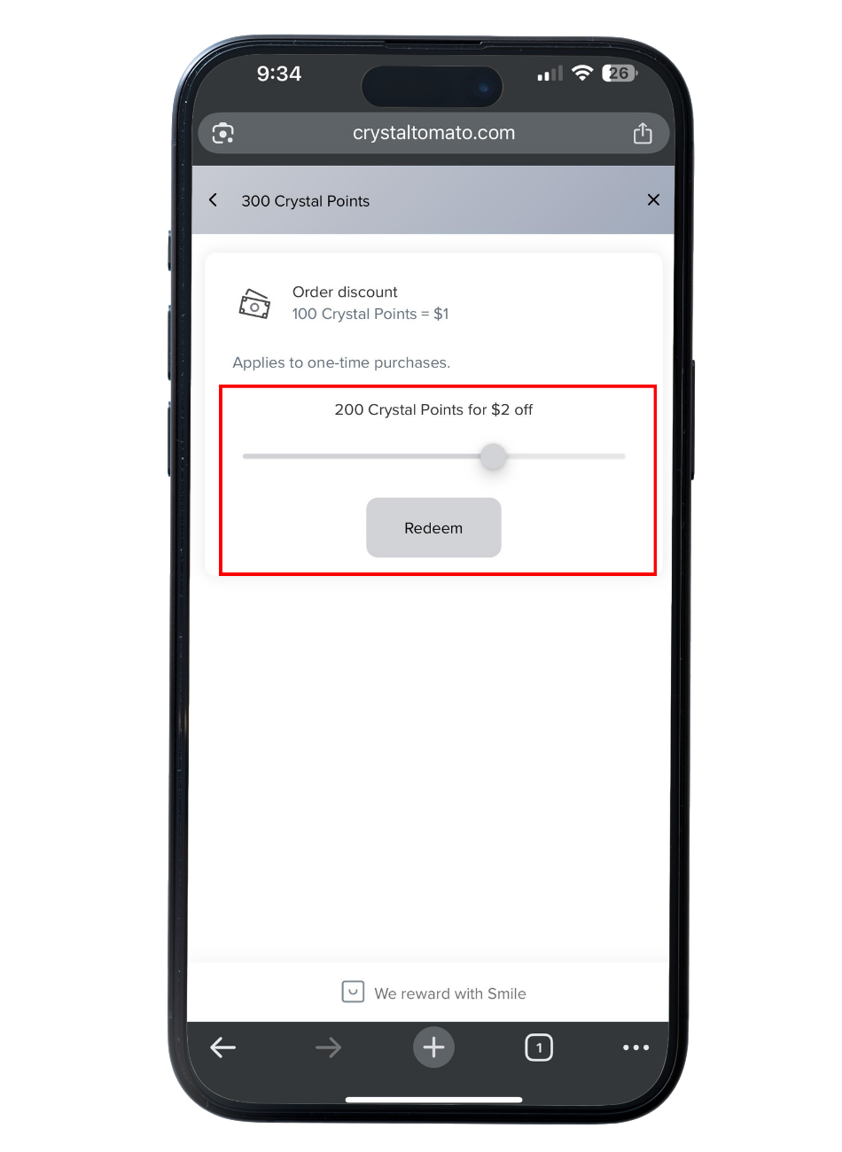 You can redeem your points through the Crystal Rewards section (bottom left of the screen). Select the number of points you’d like to use, and a discount code will be generated for you to apply at checkout.